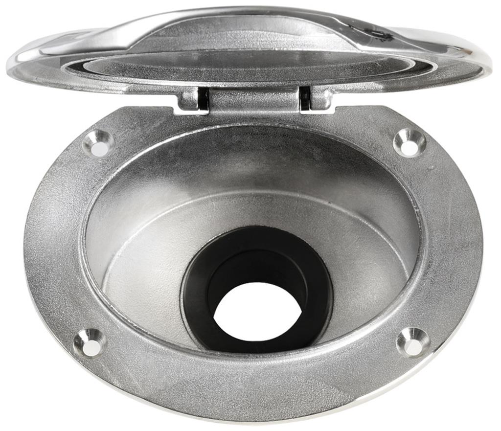 Vano doccia in acciaio inox AISI 316 con sportello autoreggente. Dotato di doccia Keji II Continuum Flow con testa maggiorata e boccola interna in gomma antivibrante.